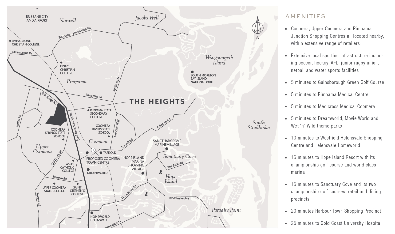The Heights is superbly located at the centre of the burgeoning growth corridor between Brisbane and the Gold Coast, with direct access to the Pacific Motorway placing the white sand beaches of Surfers Paradise just 20 minutes away and the culture and commerce of Brisbane, Queensland’s capital, only 40 minutes by car. From this central position, Coomera Train Station is an easy 10 minute drive, linking to Brisbane and Brisbane Airport, and 35 minutes from the Gold Coast International Airport.
